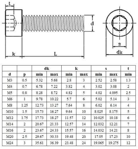 | Номинален диаметър (d) | Стъпка на резба (P) | Диаметър на глава (dk) макс. | Височина на глава (k) | Размер на шестостен (s) |